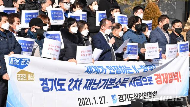 [수원=뉴시스] 김종택기자 = 경기도 상인연합회 회원들이 27일 오전 경기도 수원시 팔달구 경기도의회 앞에서 설 전에 경기도 2차 재난 지원금 지급을 호소하는 긴급 기자회견을 하고 있다 . 2021.01.27.