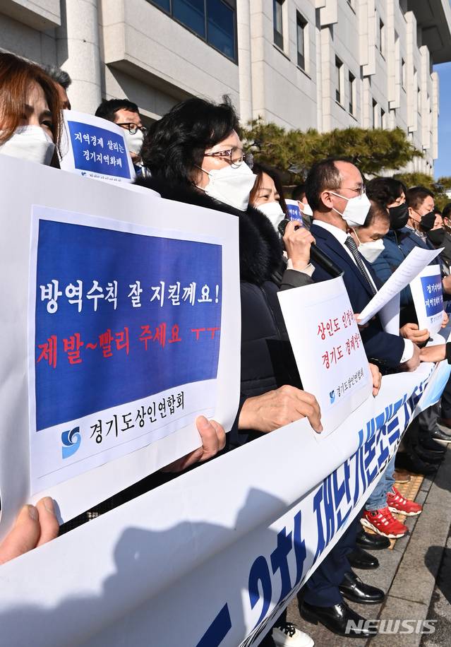 [수원=뉴시스] 김종택기자 = 경기도 상인연합회 회원들이 27일 오전 경기도 수원시 팔달구 경기도의회 앞에서 설 전에 경기도 2차 재난 지원금 지급을 호소하는 긴급 기자회견을 하고 있다 . 2021.01.27.