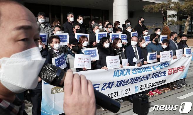 (수원=뉴스1) 조태형 기자 = 27일 오전 경기도 수원시 팔달구 경기도의회 앞에서 경기도상인연합회 회원들이 경기도 2차 재난지원금 설 전 지급 요청 기자회견을 하고 있다. 2021.1.27/뉴스1