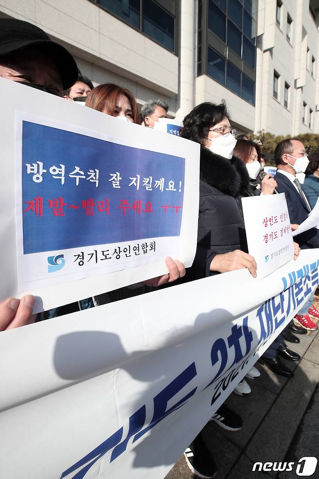 (수원=뉴스1) 조태형 기자 = 27일 오전 경기도 수원시 팔달구 경기도의회 앞에서 경기도상인연합회 회원들이 경기도 2차 재난지원금 설 전 지급 요청 기자회견을 하고 있다. 2021.1.27/뉴스1