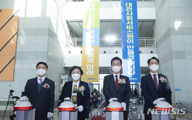 [대전=뉴시스]조명휘 기자 = 허태정 대전시장과 양성일 보건복지부 제1차관 등이 27일 오전 대전시청 시민홀에서 대전사회서비스원 개원식을 열고 있다. 왼쪽부터 양성일 차관, 유미 대전사회서비스원장, 허태정 시장, 권중순 대전시의회 의장. (사진= 대전시 제공). 2021.01.27. photo@newsis.com
