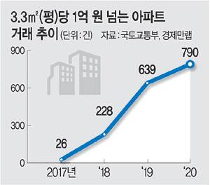 3.3㎡(평)당 매매 가격이 1억 원이 넘는 아파트 거래가 3년 새 30배 이상으로 증가한 것으로 나타났다. 문재인 정부 출범 이후 잇따른 고강도 규제로 ‘똘똘한 한 채’에 대한 수요가 증가한 영향으로 풀이된다. 3.3㎡(평)당 매매 가격이 1억 원이 넘는 단지도 70여 곳으로 20배 넘게 급증했다. 전셋값이 9000만 원이 넘는 단지도 등장했다.