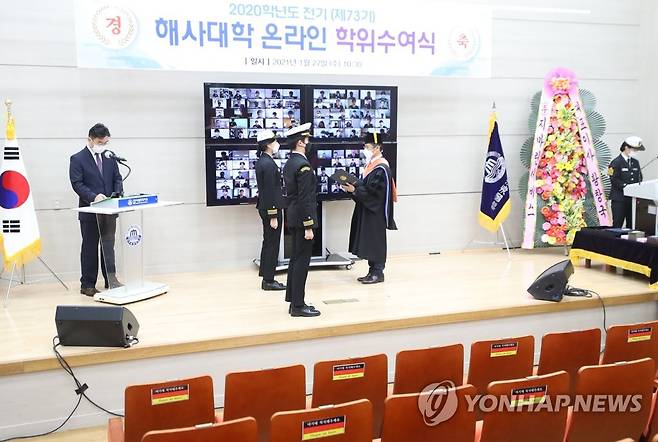 (부산=연합뉴스) 조정호 기자 = 27일 한국해양대학교가 2020학년도 해사대학 온라인 학위수여식을 열고 해사대 졸업생 대표에게 표창을 전달하고 있다. 매년 해사대 졸업생 400여 명이 학위수여식을 마치고 일제히 모자를 던지는 장면은 올해는 코로나19로 볼 수 없었다. 2021.1.27