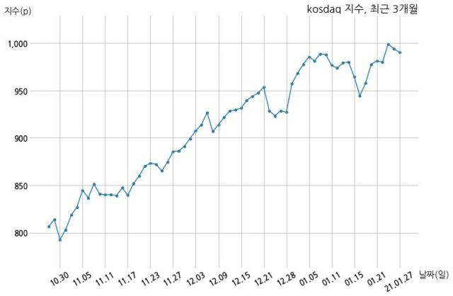 [13:00] 코스닥 시장 보합세(990p, -3.62p)