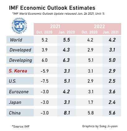 The International Monetary Fund (IMF) on Tuesday adjusted up its growth outlook for the South Korean economy this year to 3.1 percent from its October estimate of 2.9 percent, reflecting the country’s relative success in handling the pandemic.