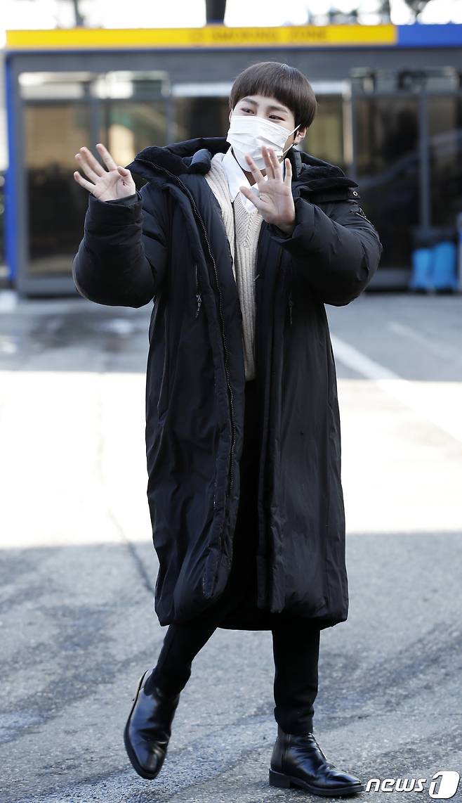 (서울=뉴스1) 권현진 기자 = 가수 하성운이 27일 서울 영등포구 여의도 KBS에서 열리는 KBS 2TV '트롯 전국체전' 촬영 차 방송국으로 들어서며 인사를 하고 있다. 2021.1.27/뉴스1