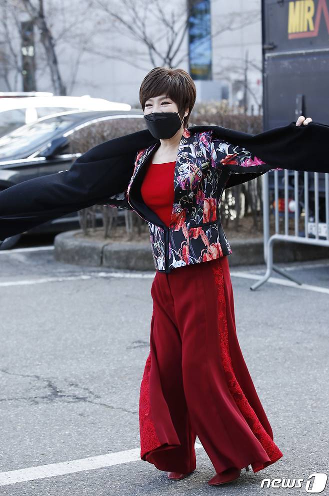 (서울=뉴스1) 권현진 기자 = 가수 김연자가 27일 서울 영등포구 여의도 KBS에서 열리는 KBS 2TV '트롯 전국체전' 촬영 차 방송국으로 들어서며 인사를 하고 있다. 2021.1.27/뉴스1