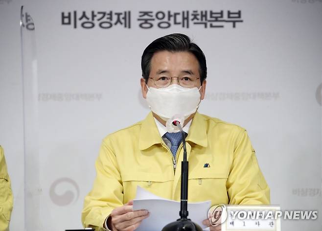 (서울=연합뉴스) 김승두 기자 = 김용범 기획재정부 제1차관이 27일 정부서울청사에서 열린 제28차 비상경제 중대본 회의 겸 2021년 제1차 혁신성장전략회의를 마친 후 브리핑하고 있다. 2021.1.27