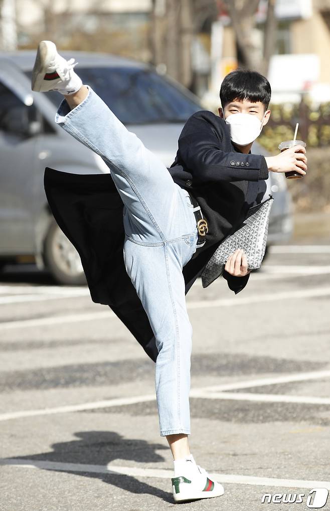 (서울=뉴스1) 권현진 기자 = 가수 나태주가 27일 서울 영등포구 여의도 KBS에서 열리는 KBS 2TV '트롯 전국체전' 촬영 차 방송국으로 들어서며 발차기를 하고 있다. 2021.1.27/뉴스1