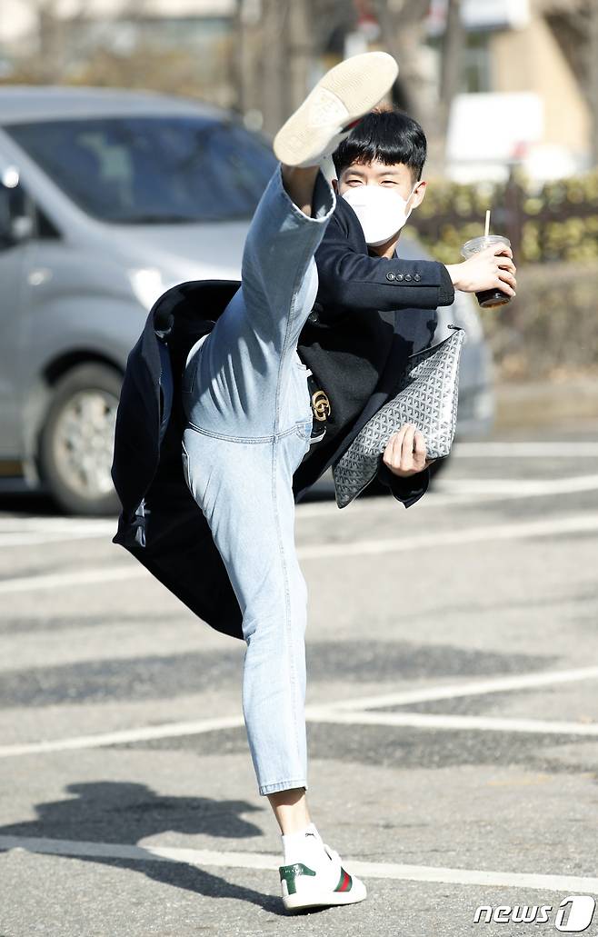 (서울=뉴스1) 권현진 기자 = 가수 나태주가 27일 서울 영등포구 여의도 KBS에서 열리는 KBS 2TV '트롯 전국체전' 촬영 차 방송국으로 들어서며 발차기를 선보이고 있다. 2021.1.27/뉴스1