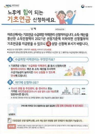 이에 따라 2020년 소득하위 70%이하 최대 지급액인 25만4760원을 지급받던 어르신은 2021년 인상된 30만원을 지급받아 매월 4만5000원의 연금액이 인상된다.