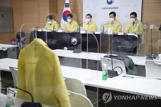 (서울=연합뉴스) 김승두 기자 = 27일 정부서울청사 브리핑실에서 열린 제28차 비상경제 중대본 회의 겸 2021년 제1차 혁신성장전략회의 결과 브리핑에는 코로나19로 비대면으로 진행된 가운데 텅 빈 기자석에는 누군가의 민방위 옷만 걸려 있다. 2021.1.27