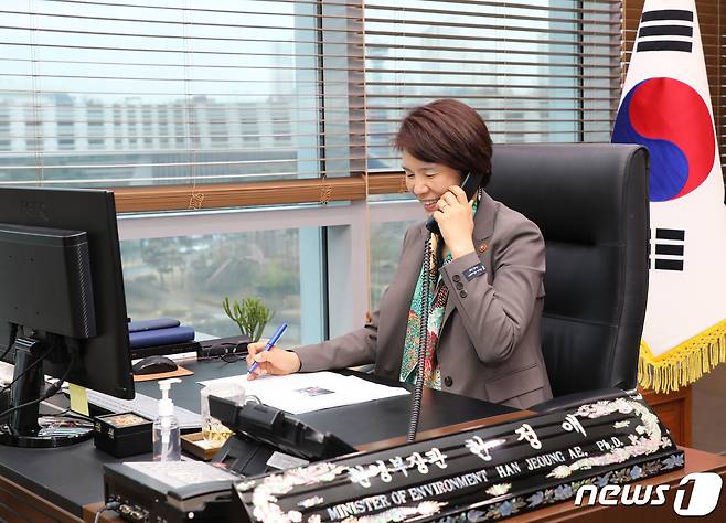 (서울=뉴스1) = 한정애 환경부 장관이 26일 정부세종청사 장관실에서 존 케리 미국 기후특사와 탄소중립 이행을 위한 상호 협력 방안에 대해 통화하고 있다. (환경부 제공) 2021.1.27/뉴스1
