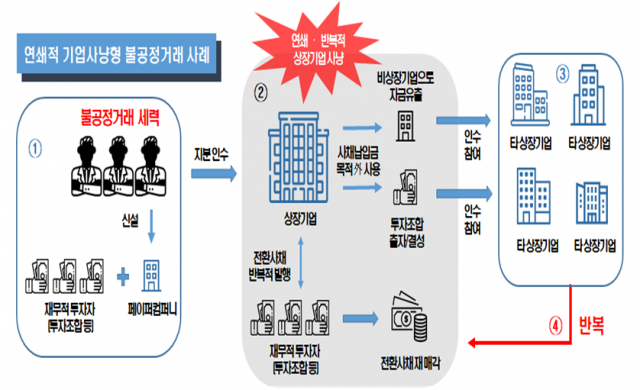 거래소에 따르면 불공정 세력은 페이퍼 컴퍼니를 세워 상장 연한이 짧고 자금이 풍부한 기업을 인수한 해 기업사냥의 자금 조달처로 활용했다. 이들은 상장 법인을 통해 정체 불분명의 비상장 법인을 고가에 인수한 뒤 과대 홍보해 주가를 인위적으로 부양했다. 아울러 전환사채(CB)를 반복 발행해 납입 자금을 투자조합과 비상장사로 빼돌려 타 상장사를 문어발식으로 사들였다.