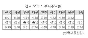 오피스는 서울, 경기에서 6%대의 투자수익률을 보이는 가운데 테헤란로, 여의도 및 분당 상권에서 높은 수익률을 나타냈다. 테헤란로 7.93%, 여의도 7.81%, 분당 7.76%였다.