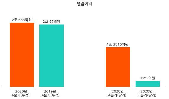 2020년 4분기 영업이익은 1조 2816억원으로 동년 3분기 영업이익 1952억원 대비 1조 864억원 증가했다.