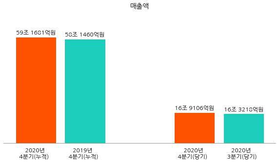 분기별 실적의 경우 2020년 4분기 매출액은 16조 9106억원으로 동년 3분기 매출액 16조 3218억원 대비 5888억원(3.6%) 증가했다.