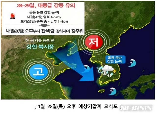 28, 29일 충북에 태풍급 강풍과 눈·비가 내릴 것으로 예보됐다.