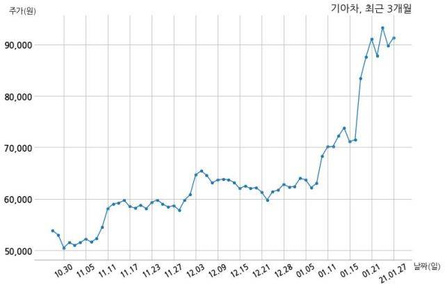 한편, 기아자동차의 14시 07분 현재주가는 91,300원으로 직전 거래일 대비 1,600원(+1.78%) 상승이며, 거래량은 8,398,802주이다.