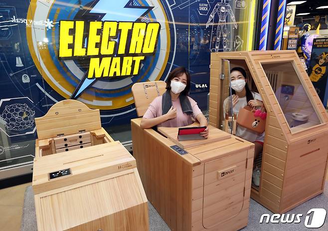 (서울=뉴스1) = 27일 오전 이마트 일렉트로마트 위례점에서 모델들이 '홈사우나'와 '반신욕기' 제품을 소개하고 있다.