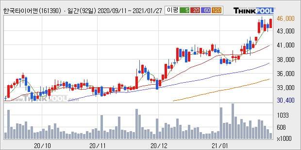 '한국타이어앤테크놀로지' 52주 신고가 경신, 단기·중기 이평선 정배열로 상승세