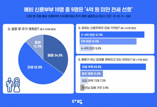 27일 다방이 예비 신혼부부 2743명을 대상으로 실시한 설문조사 결과에 따르면 전체 응답자의 절반이 넘는 52.9%(1450명)가 신혼주택 거래 방식으로 '전세'를 원한다고 답했다.