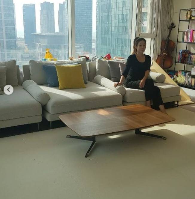 사진 속 현영은 탁 트인 거실에서 첼로를 연주하는 모습. 그 뒤로는 초고층 빌딩들이 자리한 으리으리한 시티뷰가 자리하고 있어 시선을 끈다.