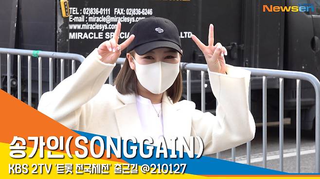이날 가수 송가인이 방송국에 들어서고 있다.
