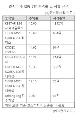 이외 코스피 상승률을 앞지른 ETF는 KODEX 200ESG(14.65%), Focus ESG리더스(13.22%), KODEX MSCI KOREA ESG유니버설(12.38%), TIGER MSCI KOREA ESG유니버설(12.16%)이다.