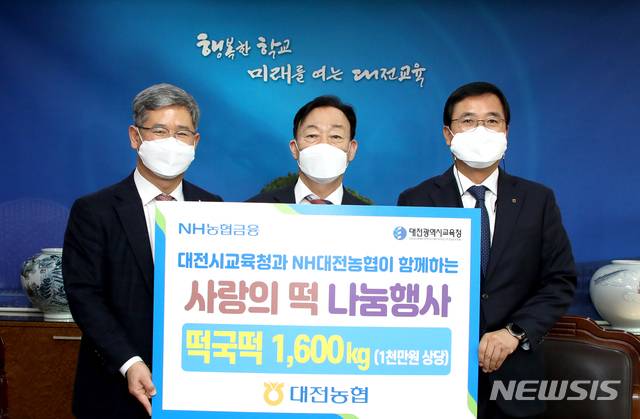 [대전=뉴시스]유순상 기자 = 설동호(가운데) 대전시교육감이 27일 시교육청에서 NH대전농협 관계자들로부터 설맞이 떡국 떡 1600kg(1000만원 상당)을 기탁받고 기념촬영을 하고 있다. 61개 교육복지우선지원사업 운영교 학생 400명에게 전달된다.(사진=대전시교육청 제공). 2021. 01.27. photo@newsis.com