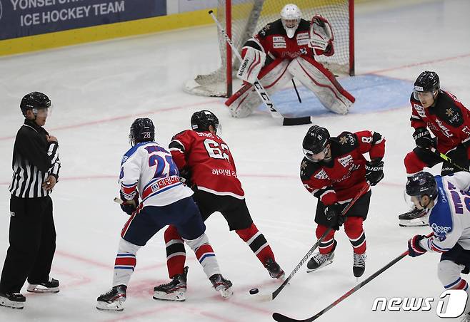 (서울=뉴스1) 박정호 기자 = 27일 오후 서울 양천구 목동 아이스링크에서 열린 제75회 전국 종합아이스하키선수권 대회 하이원과 대명의 경기에서 양팀 선수들이 치열한 승부를 벌이고 있다.