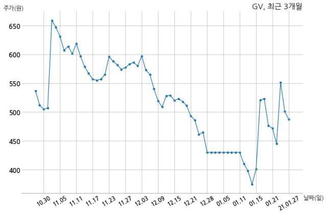 GV은 주식회사 끌렘 및 특별관계자의 지분율이 32.51%에서 12.39%로 변동했다고 27일 공시했다. 한편, GV의 14시 46분 현재주가는 487원으로 직전 거래일 대비 14원(-2.79%) 하락이며, 거래량은 6,270,346주이다.