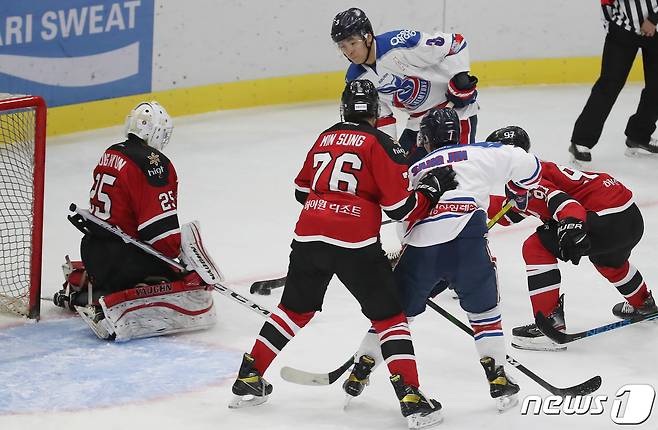 (서울=뉴스1) 박정호 기자 = 27일 오후 서울 양천구 목동 아이스링크에서 열린 제75회 전국 종합아이스하키선수권 대회 하이원과 대명의 경기에서 양팀 선수들이 치열한 승부를 벌이고 있다.