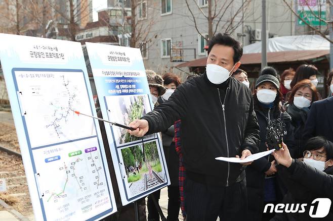 (서울=뉴스1) 국회사진취재단 = 서울시장 보궐선거에 출마한 오세훈 전 서울시장이 27일 ‘연트럴 파크'로 불리우는 서울 마포구 연남동 경의선숲길공원에서 ’균형발전 프로젝트 1탄‘ 선거 공약을 발표하고 있다. 2021.1.27/뉴스1