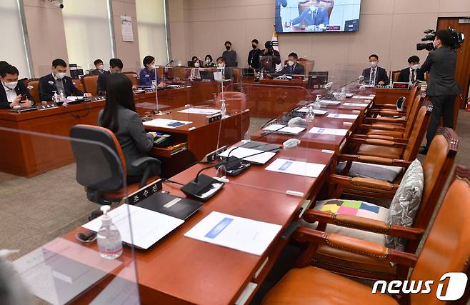 (서울=뉴스1) 박세연 기자 = 윤호중 법제사법위원장이 27일 오후 서울 여의도 국회에서 열린 법제사법위원회 전체회의에서 산회를 선포하고 있다. 국민의힘 의원들은 불참한 이번 법사위 전체회의에서 박범계 법무부 장관 후보자에 대한 인사청문경과보고서를 채택했다. 2021.1.27/뉴스1