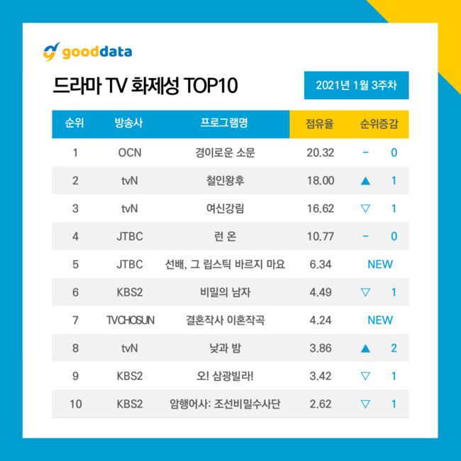 다음으로 드라마 화제성 7위는 TV CHOSUN 신작 '결혼작사 이혼작곡', 8위는 종영한 tvN '낮과 밤(전주 대비 화제성 77.79% 증가)', 9위는 KBS2 '오! 삼광빌라!(전주 대비 화제성 8.21% 증가)', 10위는 KBS2 '암행어사: 조선비밀수사단(전주 대비 화제성 17.94% 증가)' 순이었다.