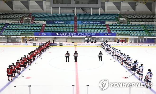 (서울=연합뉴스) 류영석 기자 = 27일 오후 서울 목동아이스링크에서 제75회 전국 종합아이스하키선수권대회 대명 킬러웨일즈와 하이원의 경기 전 선수들이 국기에 경례하고 있다. 2021.1.27