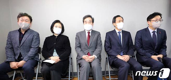 (서울=뉴스1) 박세연 기자 = 이낙연 더불어민주당 대표가 27일 오후 서울 여의도 서울시당에서 열린 정책엑스포 in 서울에서 서울시장 보궐선거에 출마한 박영선 전 중소벤처기업부장관, 우상호 의원과 함께 자리하고 있다. 왼쪽부터 기동민 더불어민주당 서울시당위원장, 박영선 전 장관, 이낙연 대표, 우상호 의원, 홍익표 민주연구원장. 2021.1.27/뉴스1
