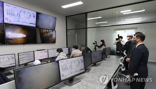 (서울=연합뉴스) 정병선 과학기술정보통신부 제1차관이 27일 오후 충남 금산군 이노스페이스 성능시험장을 방문해 5t급 하이브리드 로켓엔진의 연소시험을 참관하고 있다. 2021.1.27