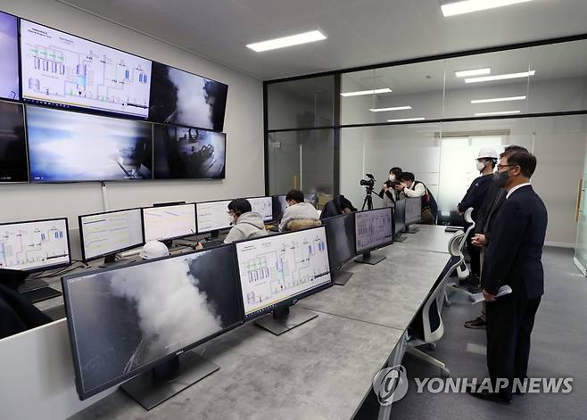 (서울=연합뉴스) 정병선 과학기술정보통신부 제1차관이 27일 오후 충남 금산군 이노스페이스 성능시험장을 방문해 5t급 하이브리드 로켓엔진의 연소시험을 참관하고 있다. 2021.1.27