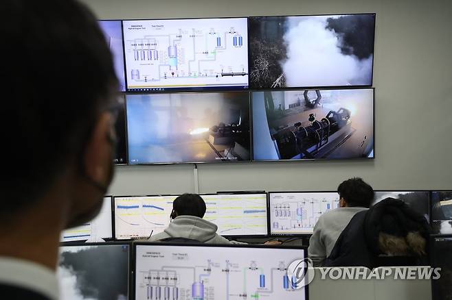 (서울=연합뉴스) 정병선 과학기술정보통신부 제1차관이 27일 오후 충남 금산군 이노스페이스 성능시험장을 방문해 5t급 하이브리드 로켓엔진의 연소시험을 참관하고 있다. 2021.1.27
