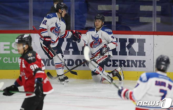 (서울=뉴스1) 박정호 기자 = 27일 오후 서울 양천구 목동 아이스링크에서 열린 제75회 전국 종합아이스하키선수권 대회 하이원과 대명의 경기에서 대명 선수들이 첫골을 넣은 후 기뻐하고 있다.