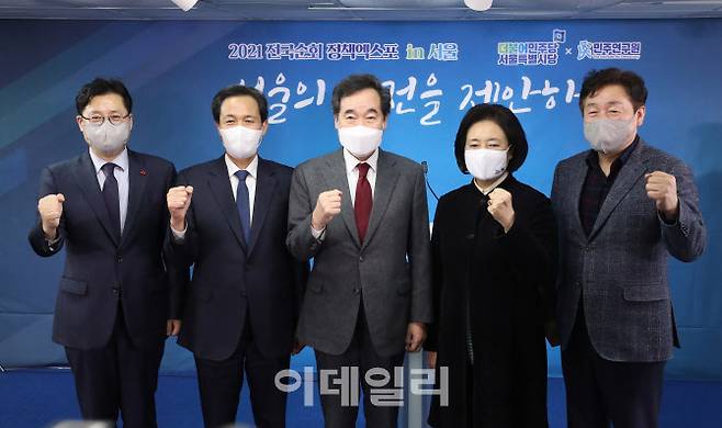 사진 왼쪽부터 홍익표 민주연구원장, 우상호 의원, 이낙연 대표, 박영선 전 장관, 기동민 더불어민주당 서울시당위원장.