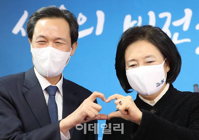 [이데일리 방인권 기자] 서울시장 보궐선거에 출마선언한 박영선 전 중소벤처기업부장관과 우상호 더불어민주당 의원이 27일 오후 더불어민주당 정책엑스포 in 서울 행사가 열린 서울 여의도 서울시당사에서 손 하트를 만들어보이고 있다.