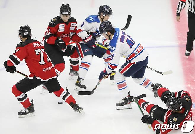 (서울=뉴스1) 박정호 기자 = 27일 오후 서울 양천구 목동 아이스링크에서 열린 제75회 전국 종합아이스하키선수권 대회 하이원과 대명의 경기에서 양팀 선수들이 치열한 승부를 벌이고 있다.
