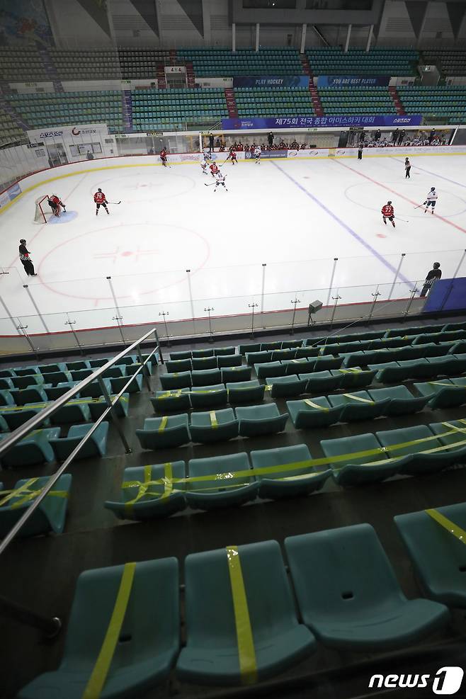 (서울=뉴스1) 박정호 기자 = 27일 오후 서울 양천구 목동 아이스링크에서 열린 제75회 전국 종합아이스하키선수권 대회 하이원과 대명의 경기가 무관중 속에 진행되고 있다.