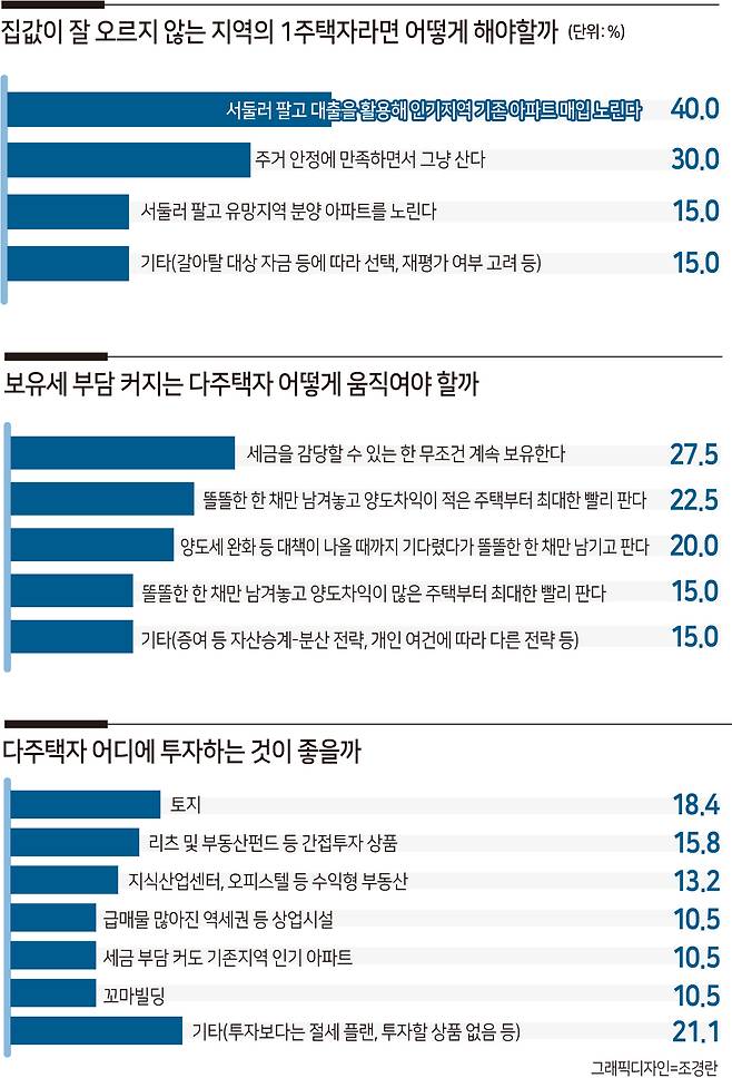 ‘세금을 감당할 수 있는 한 보유하는 것이 좋다’는 의견(11명·27.5%)도 그 뒤를 이었다. 우병탁 신한은행 부동산투자자문센터 팀장은 “보유세 부담의 체감은 규모와 단지에 따라 다르다”며 “전망보다 현금 흐름 파악이 중요할 것”이라고 봤다.