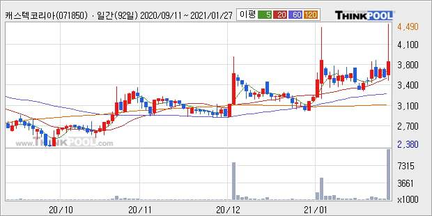 '캐스텍코리아' 52주 신고가 경신, 단기·중기 이평선 정배열로 상승세