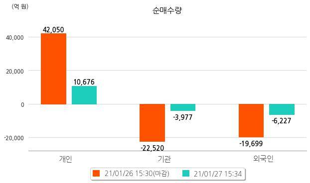 투자자별 동향을 살펴보면 기관은 3,977억원 순매도했으며, 외국인도 6,227억원 순매도했다.