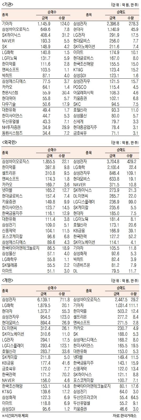 [표]유가증권 기관·외국인·개인 순매수·도 상위종목( 1월 27일)